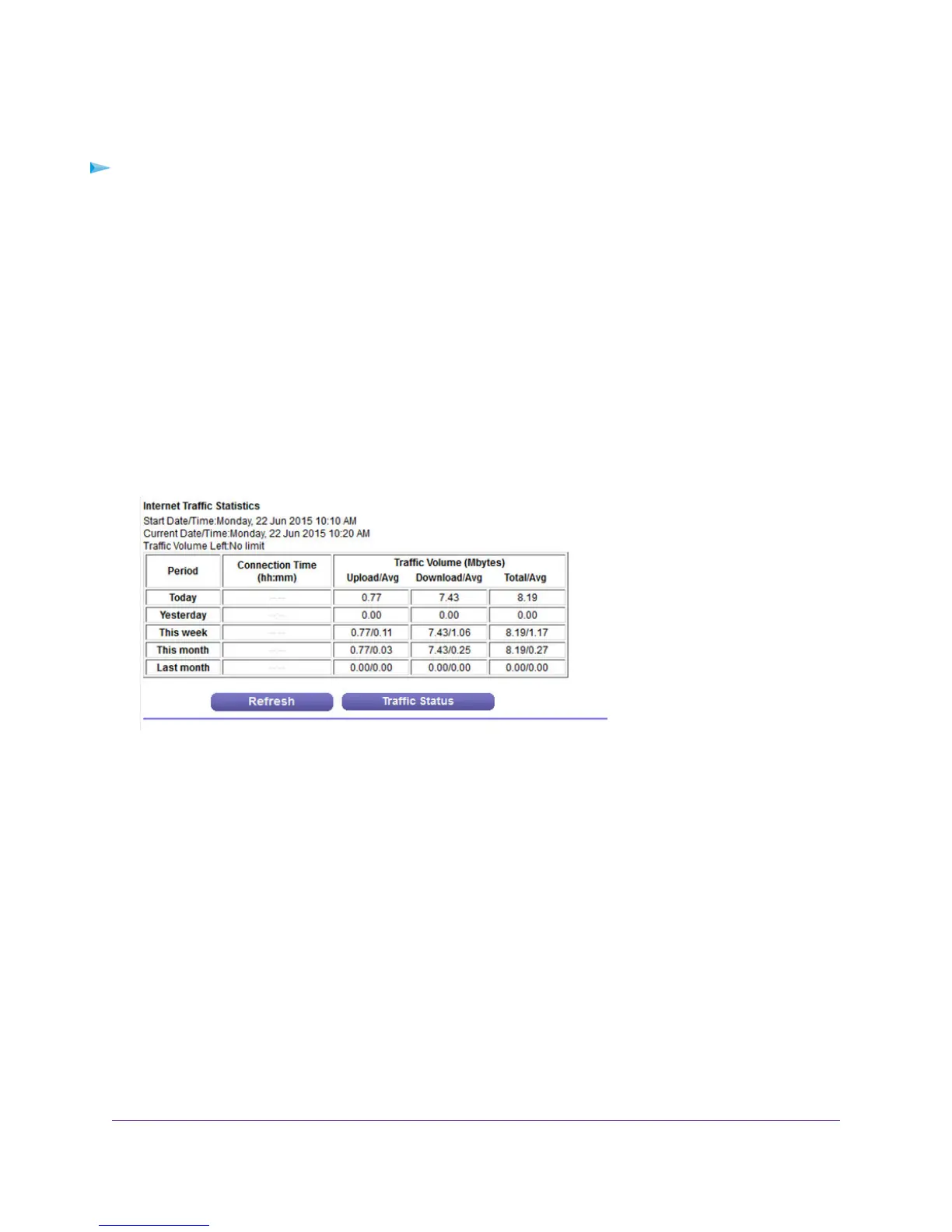 The Internet Traffic Statistics section displays when the traffic counter was started and what the traffic balance