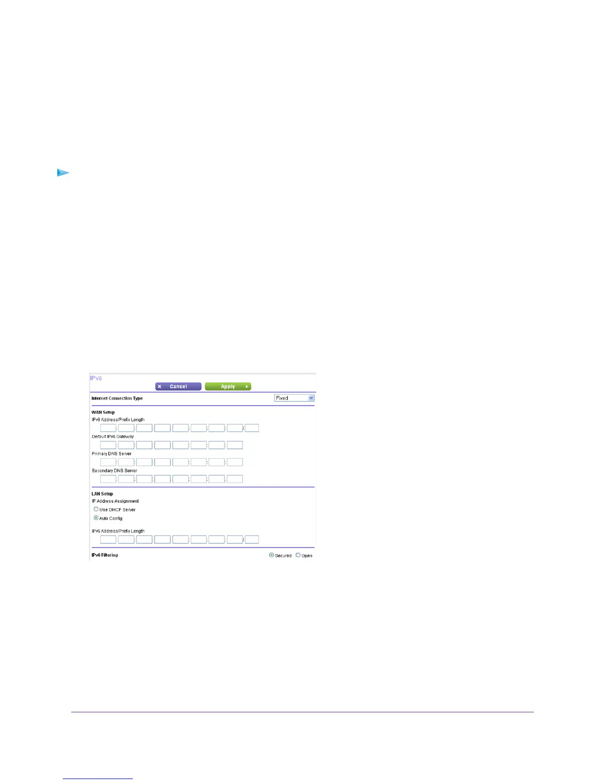 • Default IPv6 Gateway. The IPv6 address of the default IPv6 gateway for the router’s WAN interface.