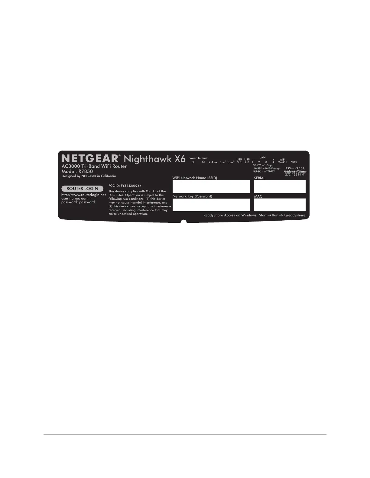 The label on the router shows the login information, WiFi Network Name (SSID), network