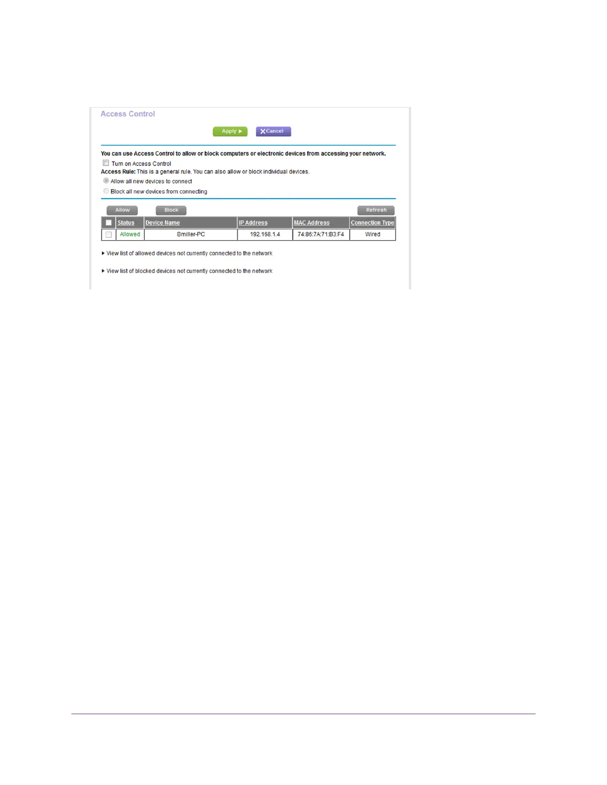 7. To view allowed or blocked devices that are not connected, click one of the following links: