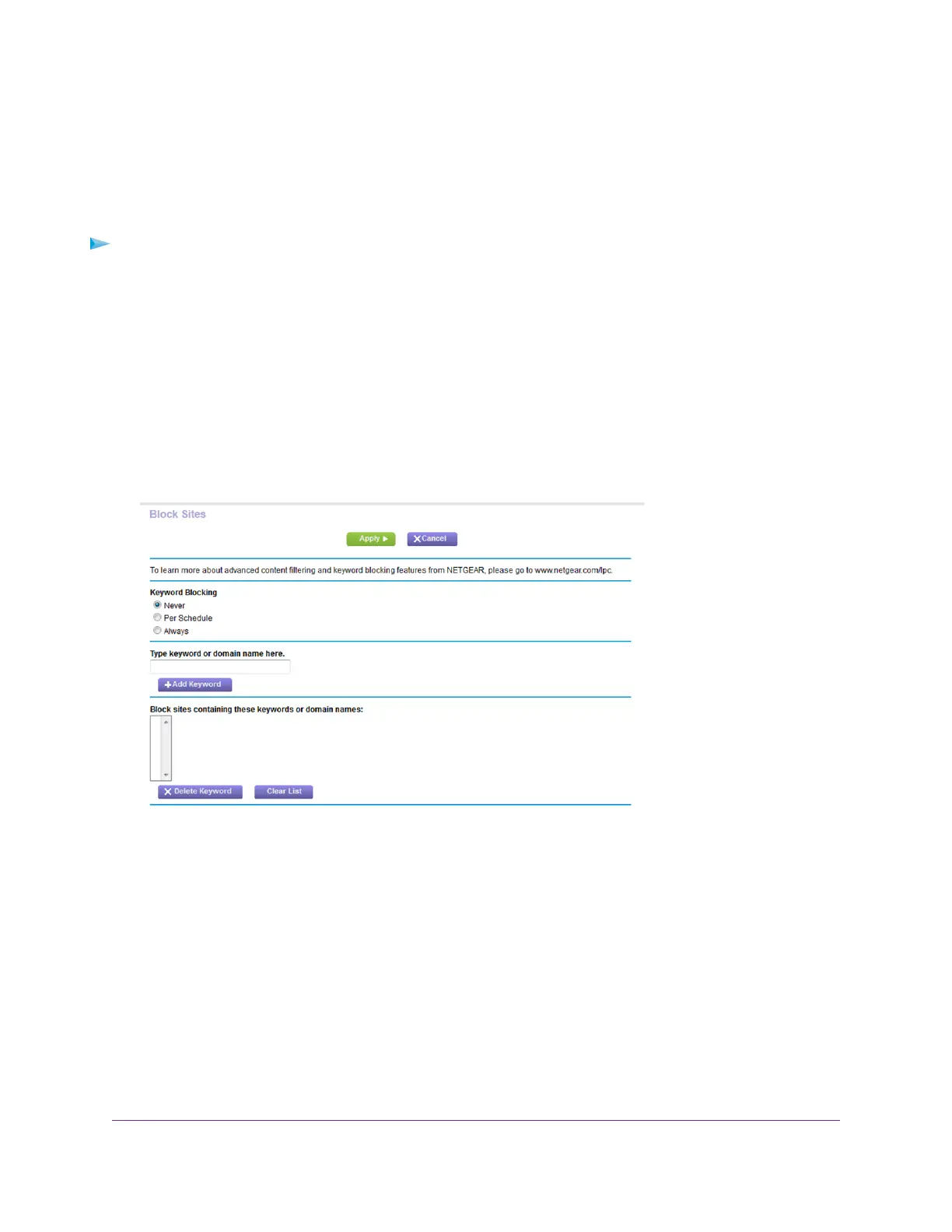 • Per Schedule.Turn on keyword blocking according to a schedule that you set. (See Schedule When to