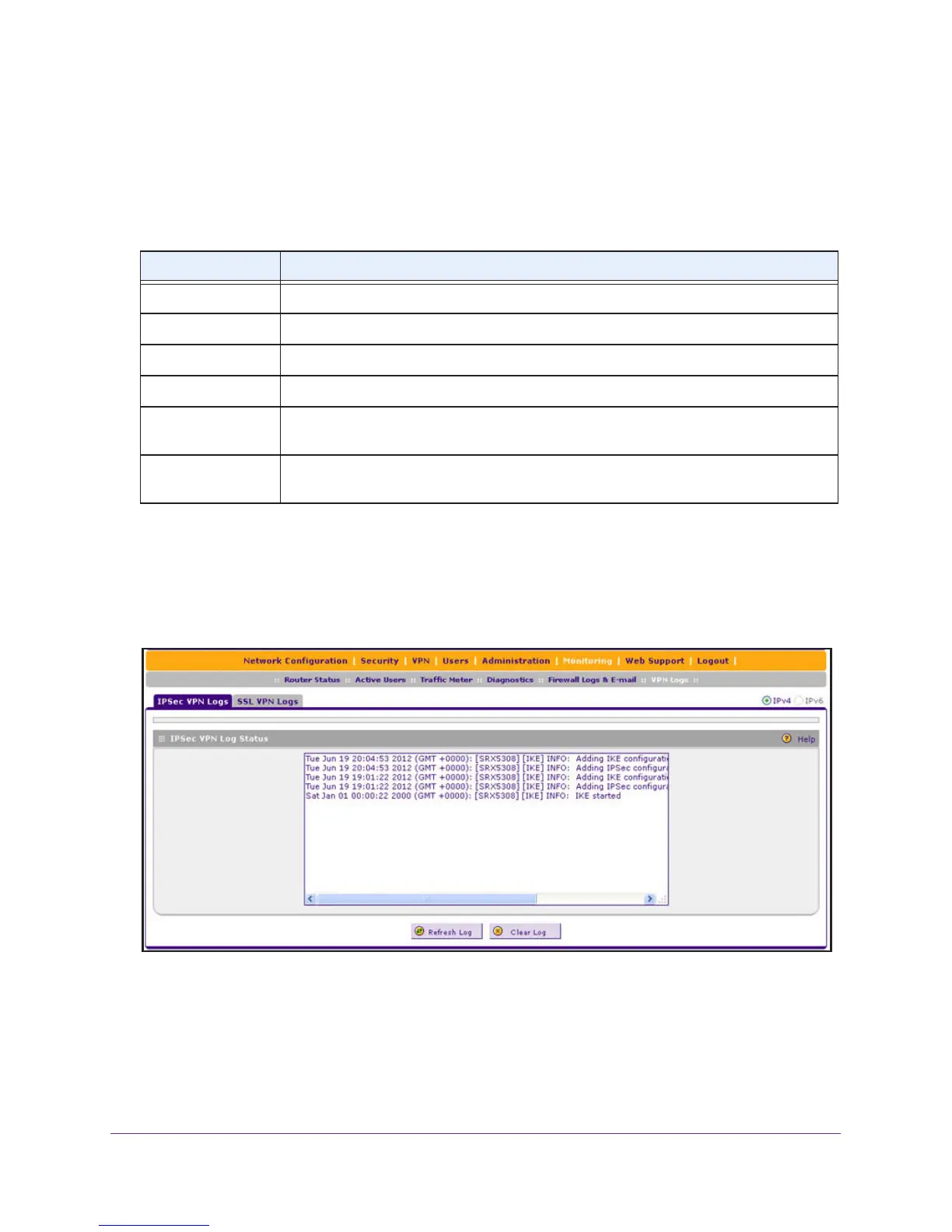 Select Monitoring > VPN Logs > IPSec VPN Logs. The IPSec VPN Logs screen displays: