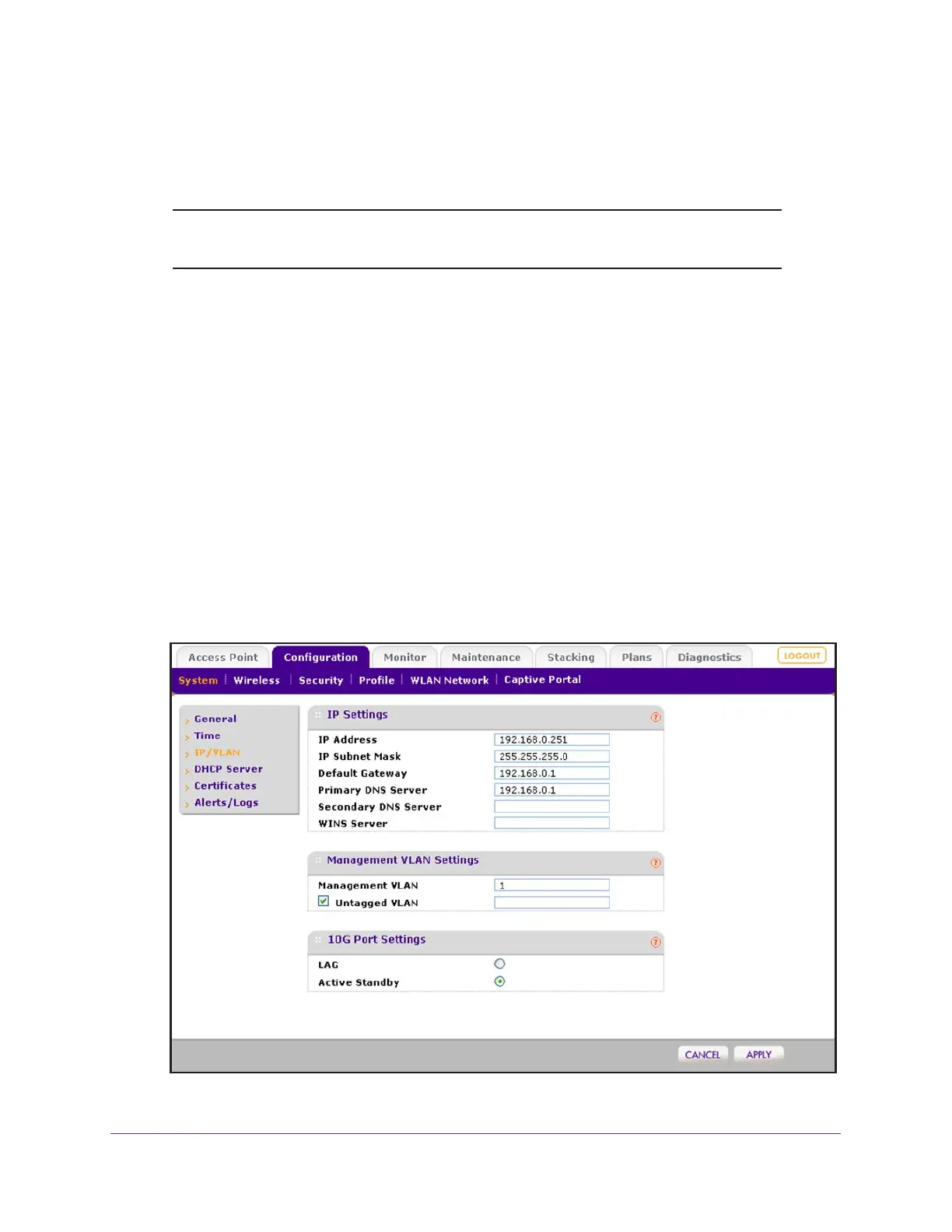 You can configure the management IP address, VLAN settings, and link aggregation (LAG)