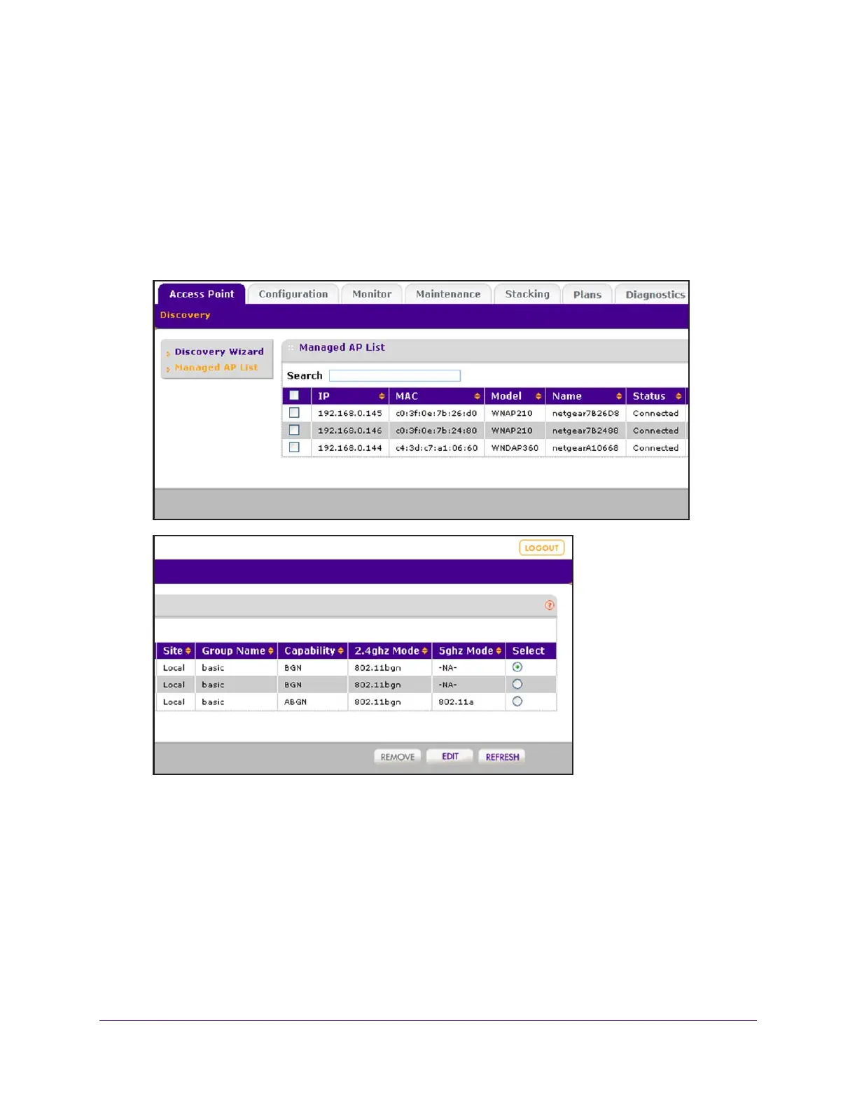 The Managed AP List page displays. Because this page is wide, it is shown in the