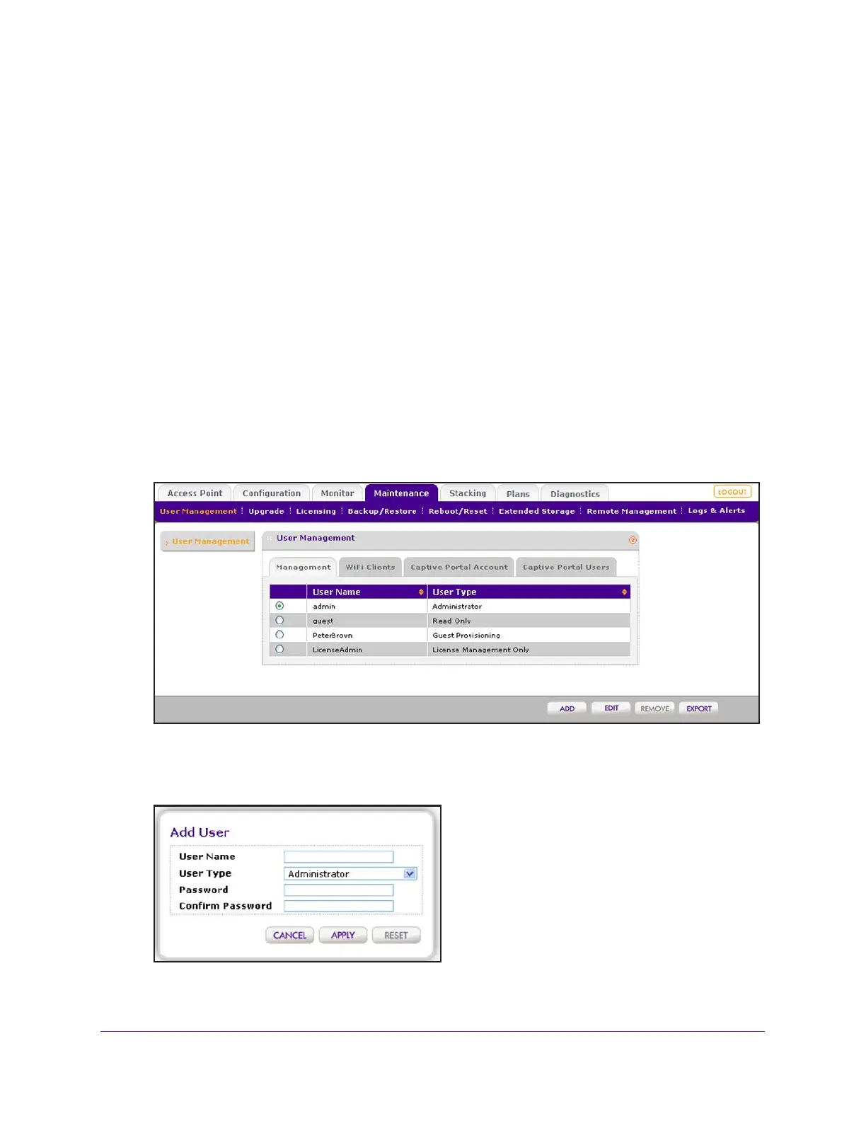 You can add an administrator, a user with read-only access to the wireless controller’s web