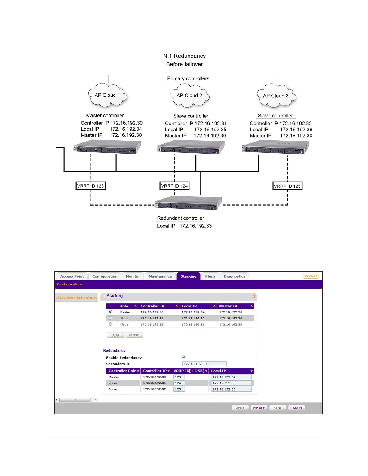 The following figure shows the N:1 settings on the Redundancy page before a failover