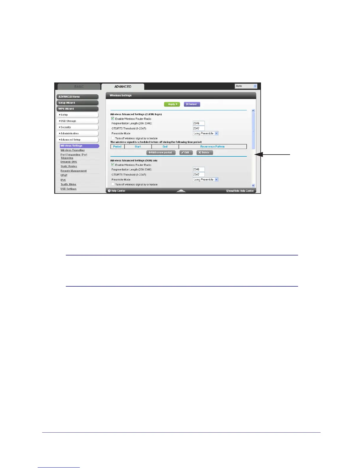 Select Advanced > Advanced Setup > Wireless Settings to display the following screen: