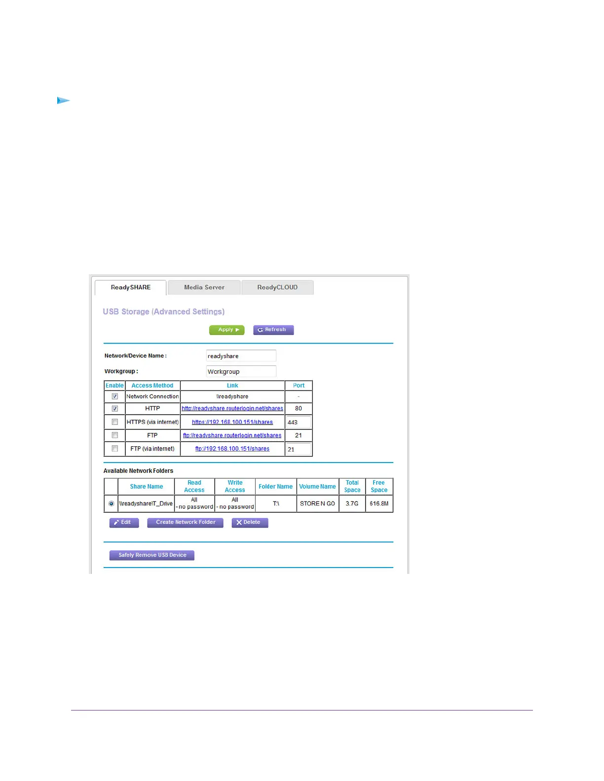 4. Select ADVANCED > USB Functions> ReadySHARE Storage.