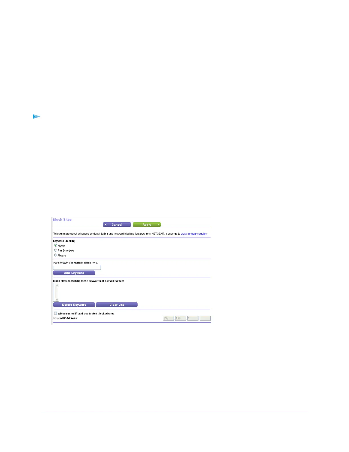 Per Schedule. Turn on keyword blocking according to a schedule that you set. (See Schedule
