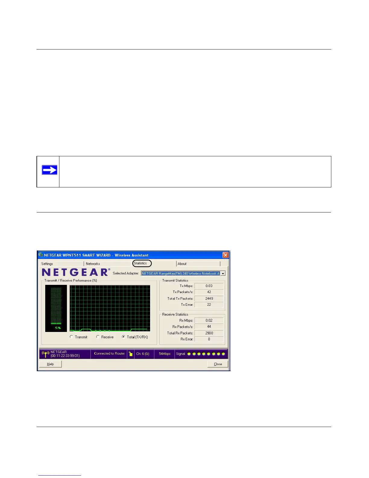 • Transmit/Receive Performance (%): A real time graph identifying the total, receive, and