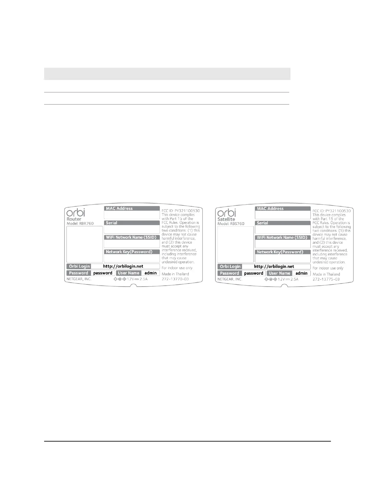 The Orbi router and satellite labels show the router’s or satellite's MAC address and