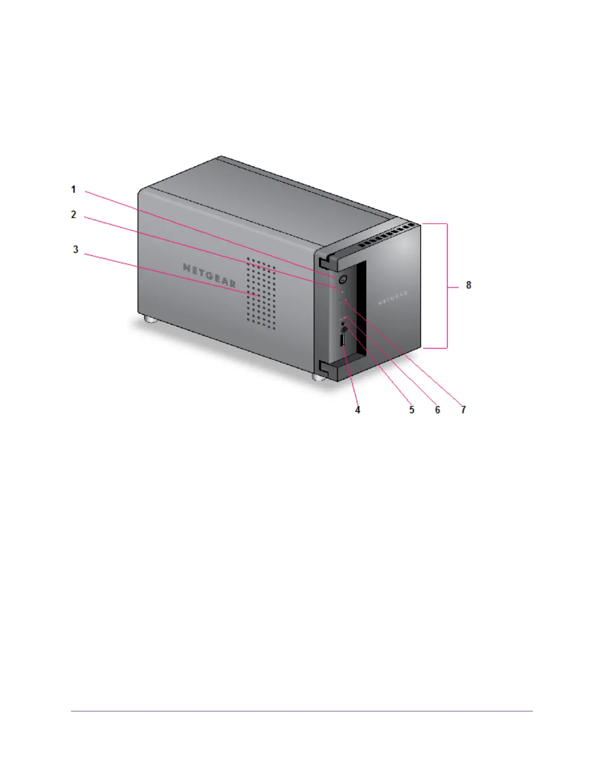 The following figure shows the front and side panels of the ReadyNAS 102.
