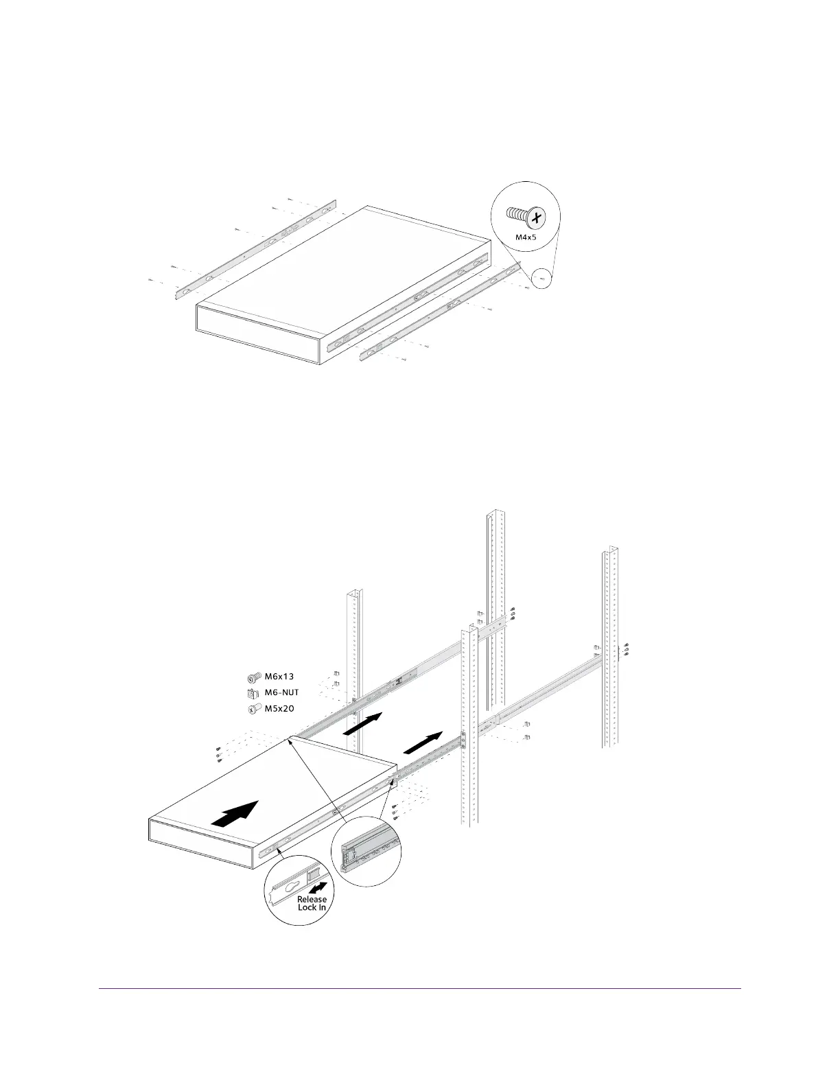 c. Hang the hooks of the rails in the rack holes, and fasten the rails to the rack.