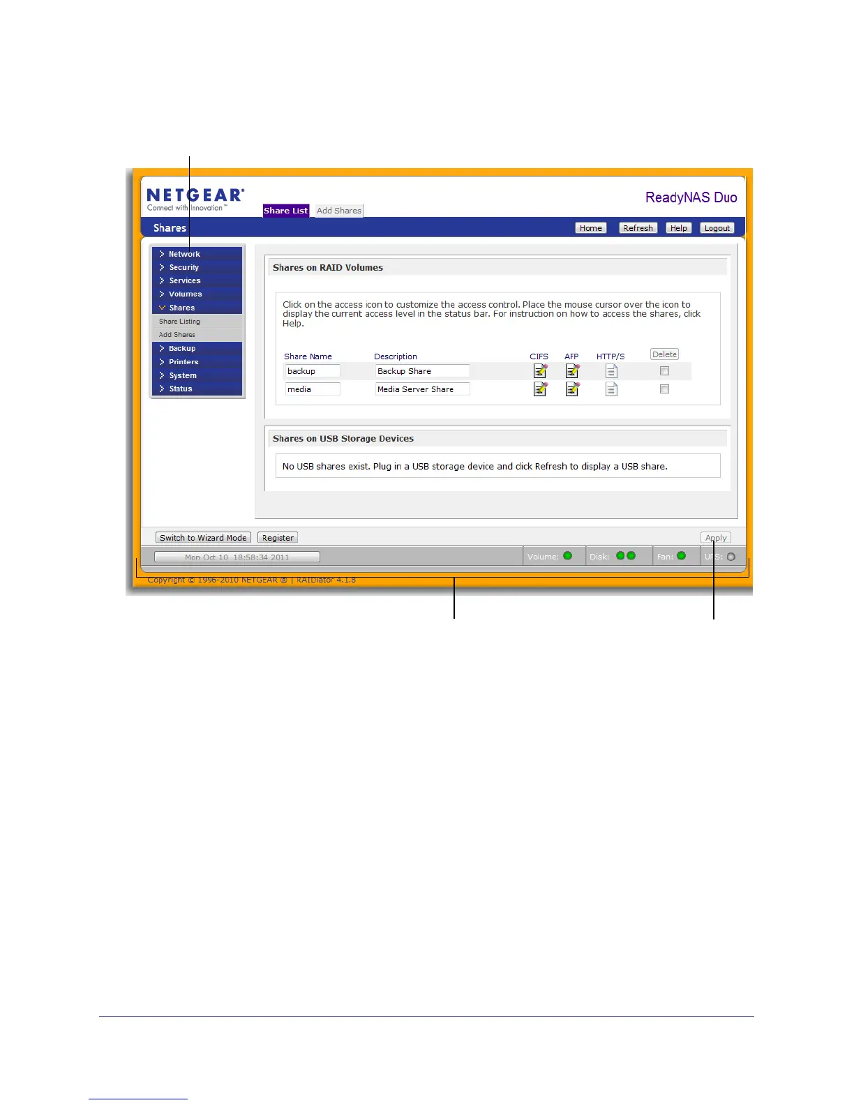 The status bar displays the current time and the status of the ReadyNAS system’s