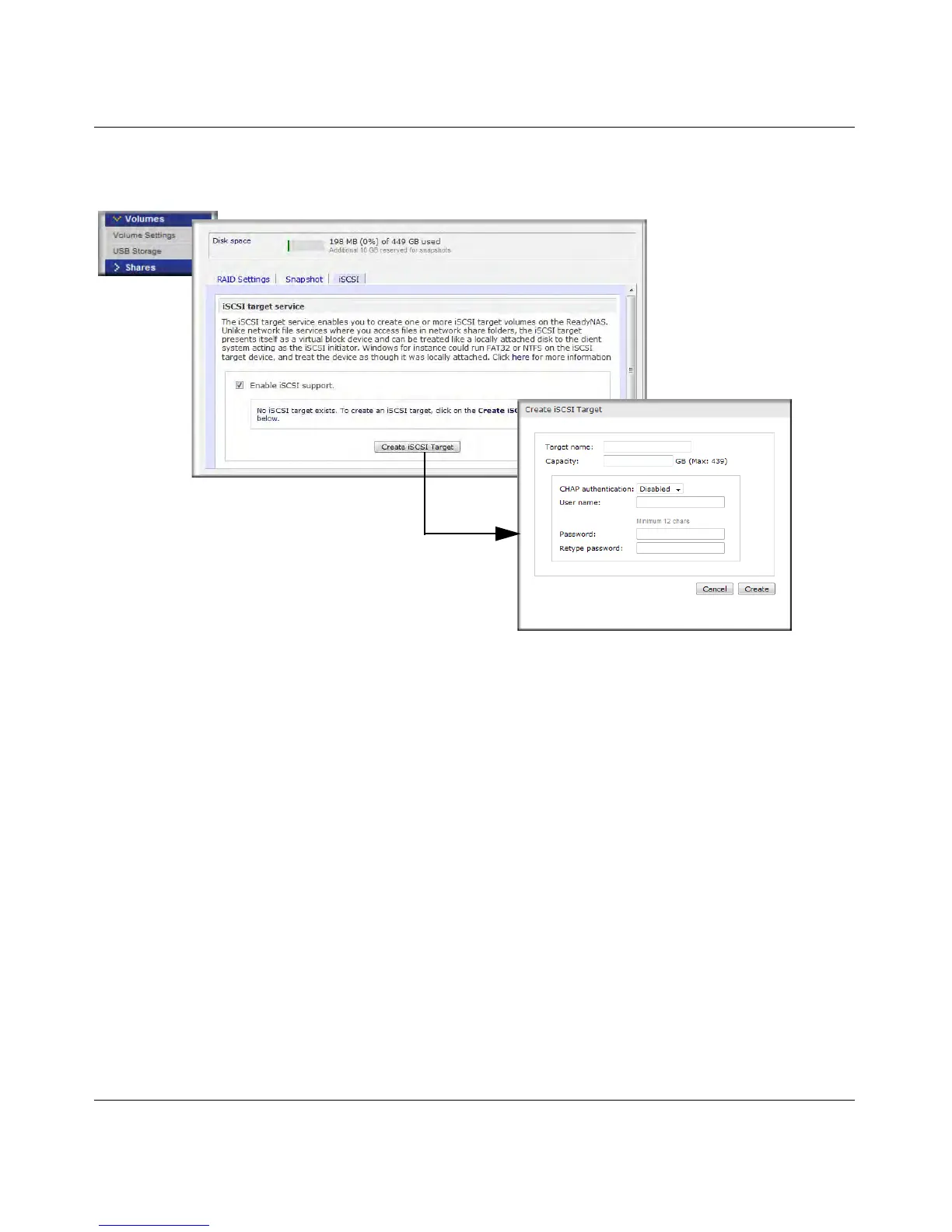 To configure an iSCSI target volume on the ReadyNAS, go to Volumes > Volume Settings >