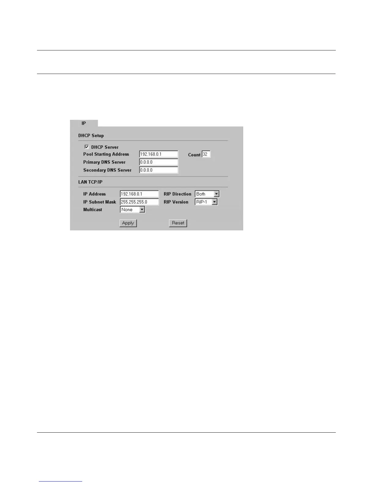 • DHCP server enabled with 32 client addresses starting from 192.168.0.1.