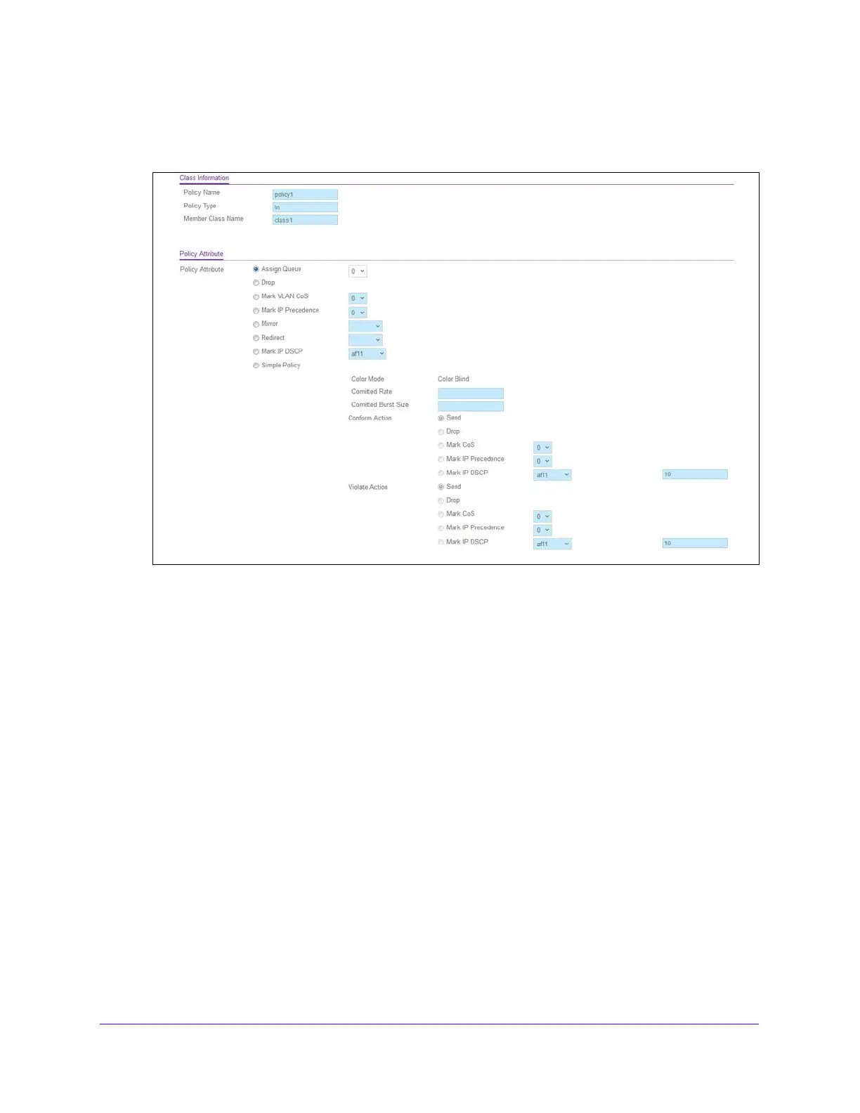 Policing Attributes screen, this lists the DiffServ classes that are valid for use as a conform