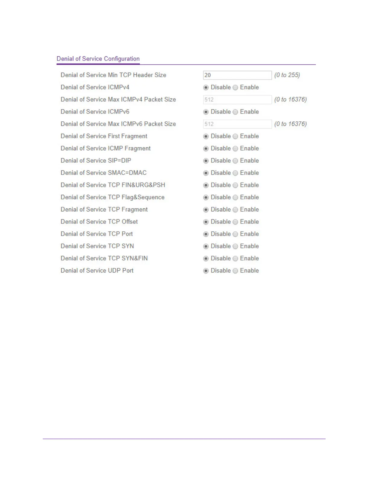 allowed. If DoS TCP Fragment is enabled, the switch will drop packets that have a