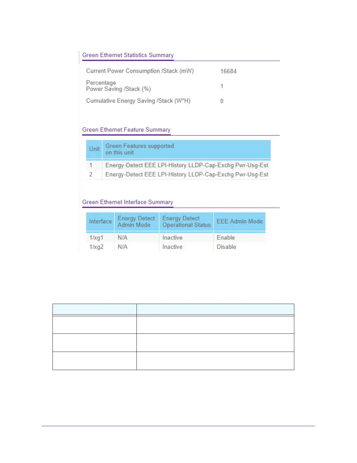 Table 19, Green Ethernet statistics summary describes the information the Green Ethernet