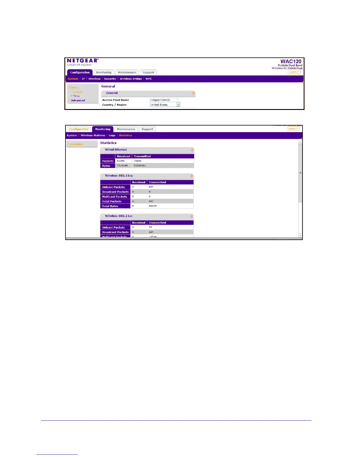 • Total Bytes. The wireless bytes sent and received since the access point was