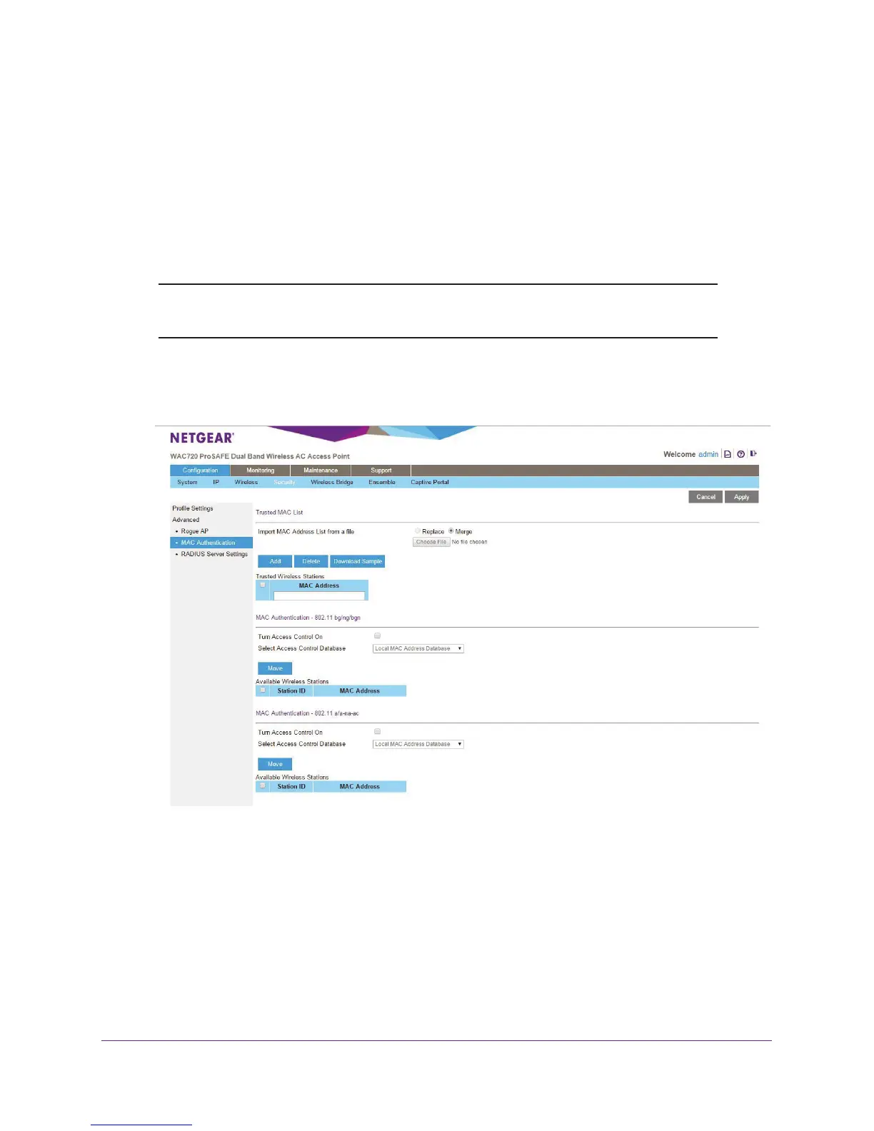 1. Select Configuration > Security > Advanced > MAC Authentication.