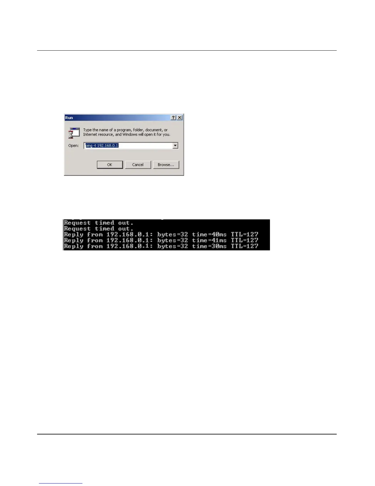 b. Assuming the target PC is configured with 192.168.0.1 as its IP address, type ping -t