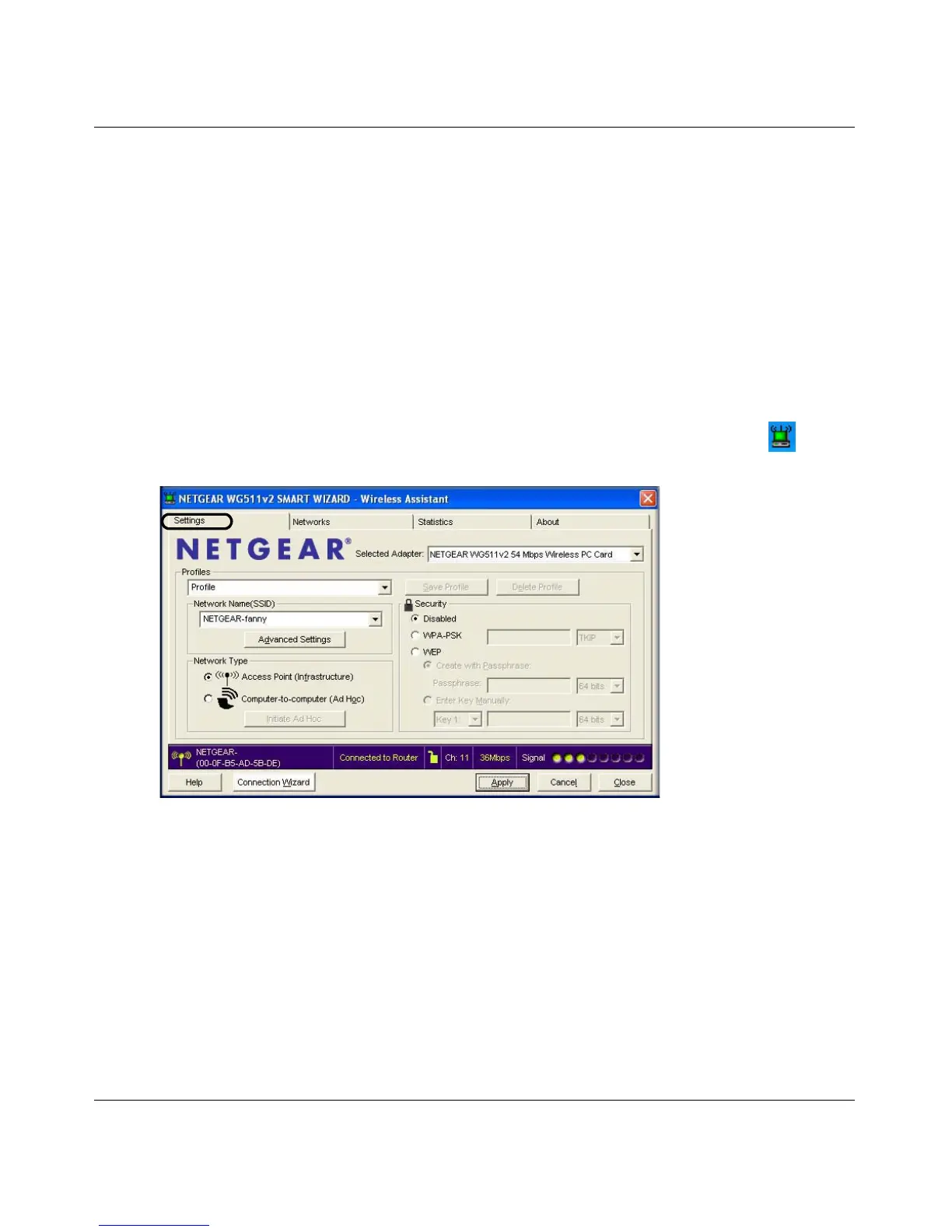 b. Open the Smart Wizard Wireless Assistant by clicking on the WG511 v2 icon in the