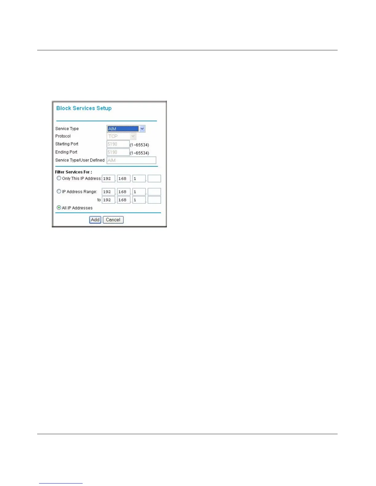 3. Specify a service for blocking by clicking Add. The Block Services Setup screen displays.