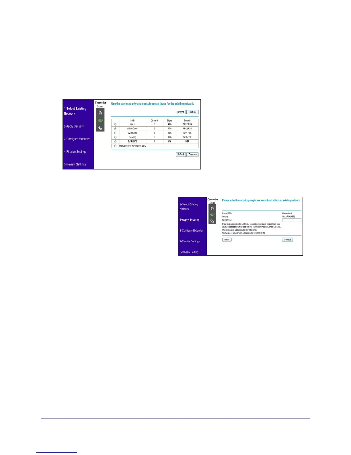 Existing Network. The Extender scans for wireless networks, and displays a list.