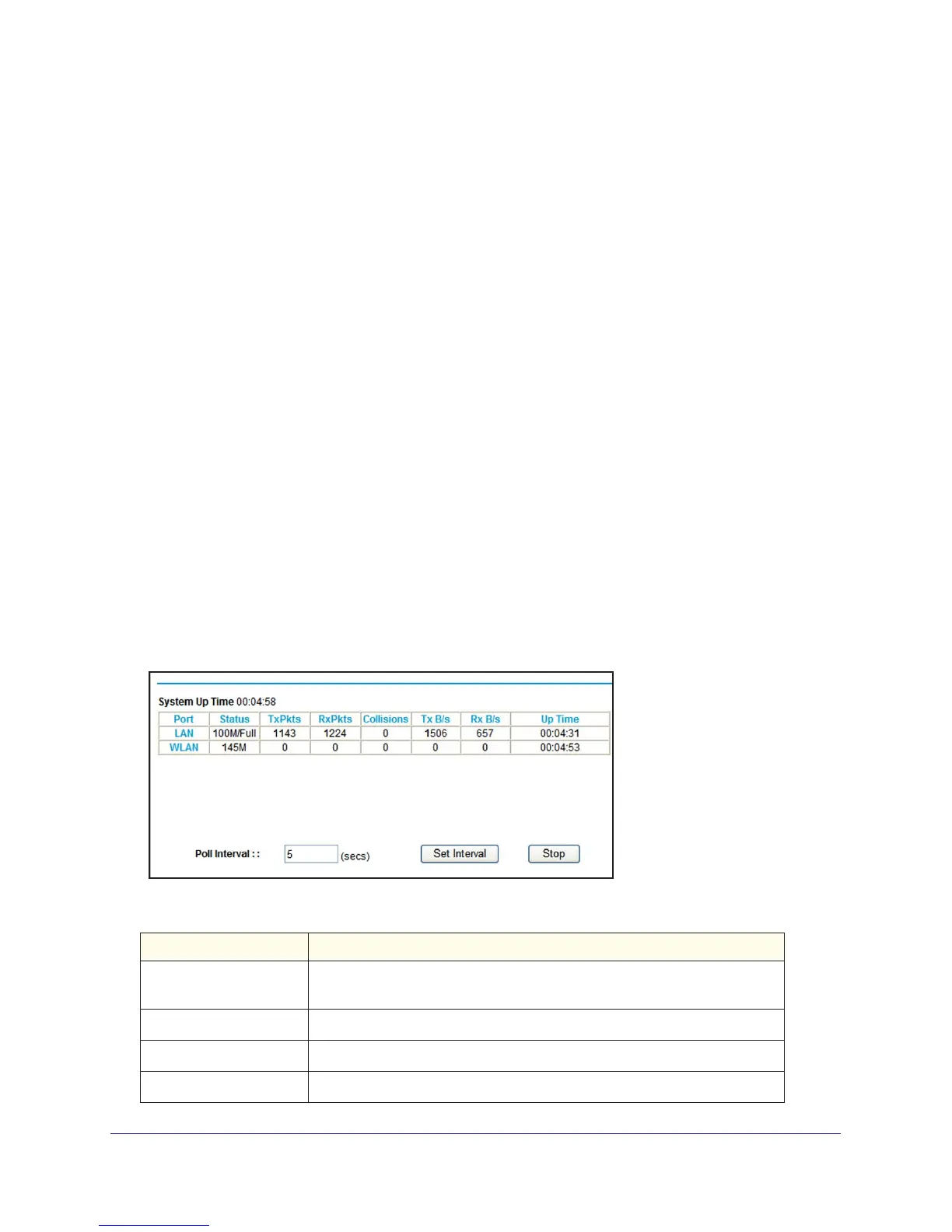 LAN or WLAN (Port) The statistics for the LAN (local), and wireless LAN (WLAN) ports. For each