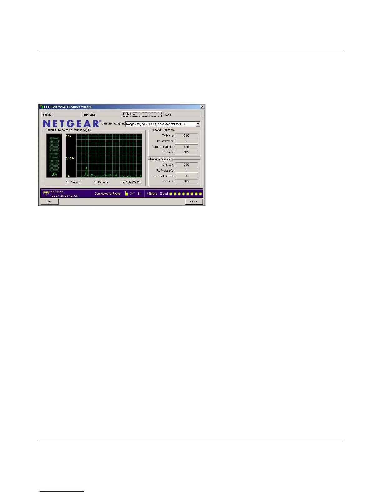 • Transmit/Receive Performance (%): A real time graph identifying the total, receive, and
