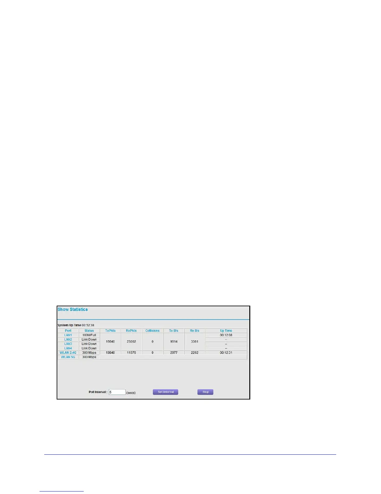 Scroll to the bottom of the Status screen, and click Show Statistics. The following screen