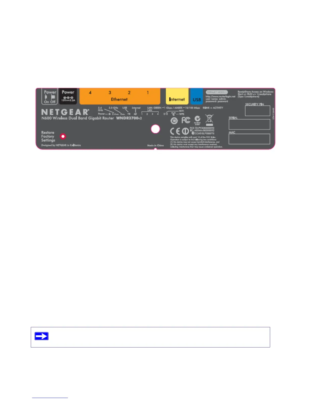 number, port connectors, status lights, and default login information.