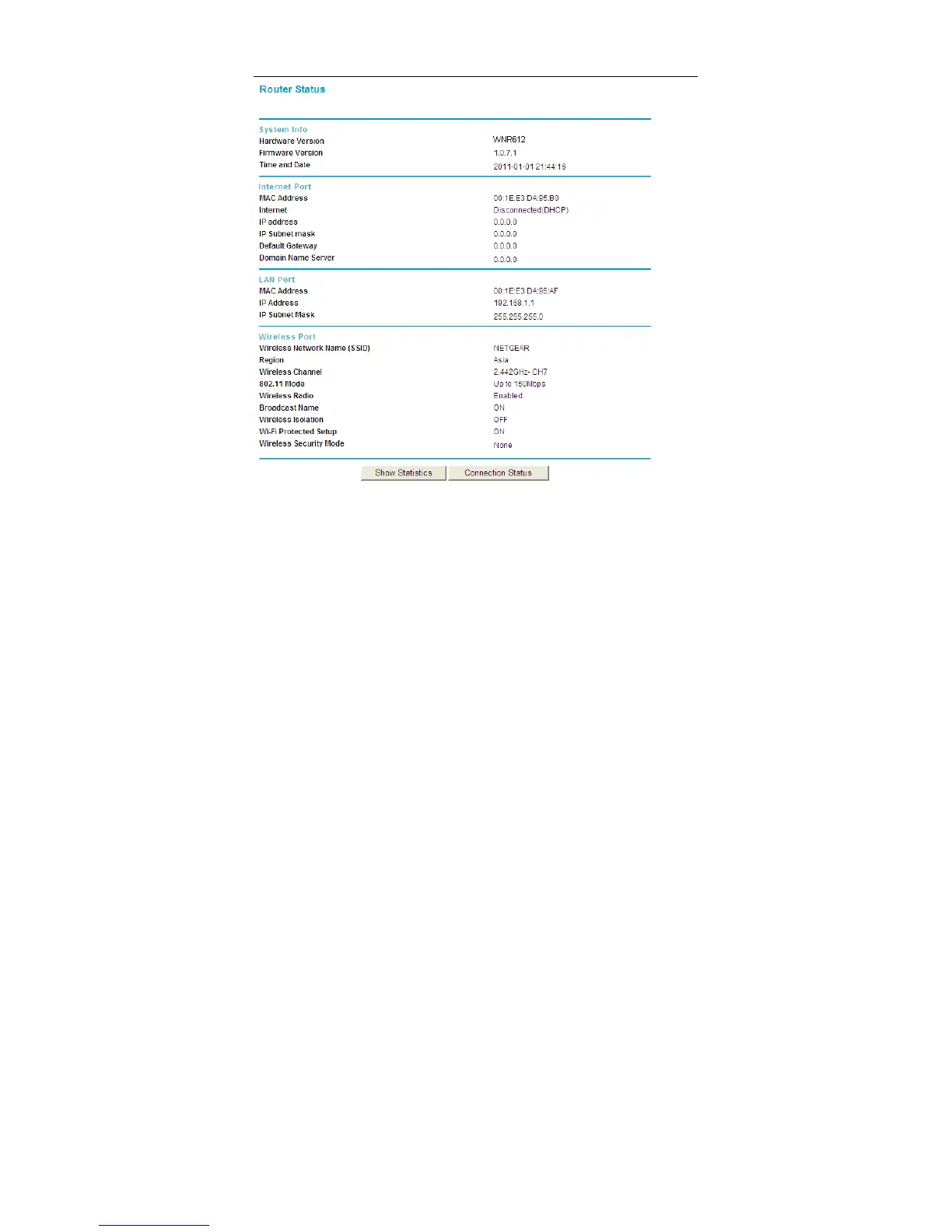 including system information, connection status of the Internet port, LAN port, and