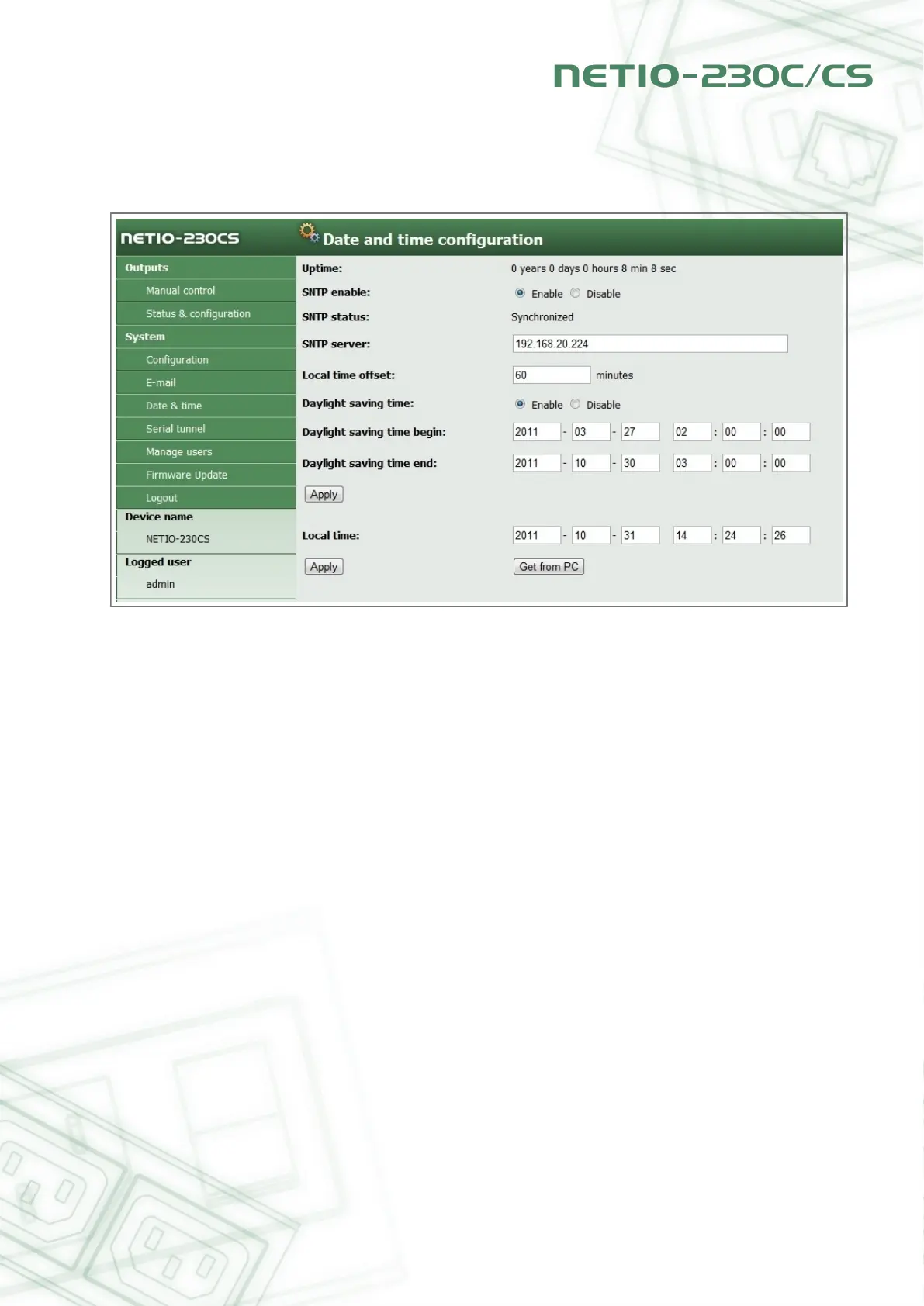 Local time: manual setting of local time with deactivated synchronisation with SNTP