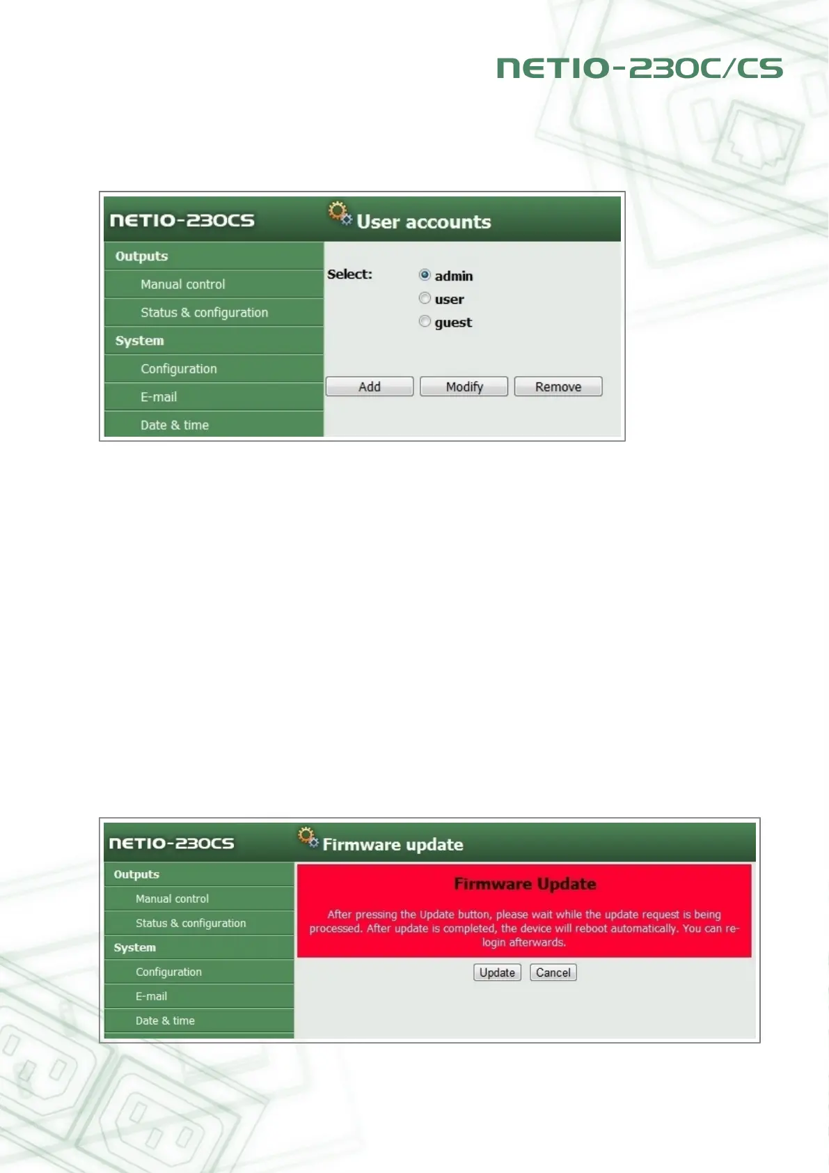 The Firmware Update page is used to download new firmware into the NETIO device. Upon clicking the item