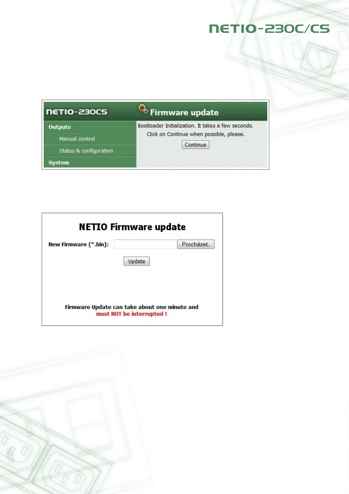 Now insert the firmware file with suffix .bin and click Update. Download of the new firmware takes about 2