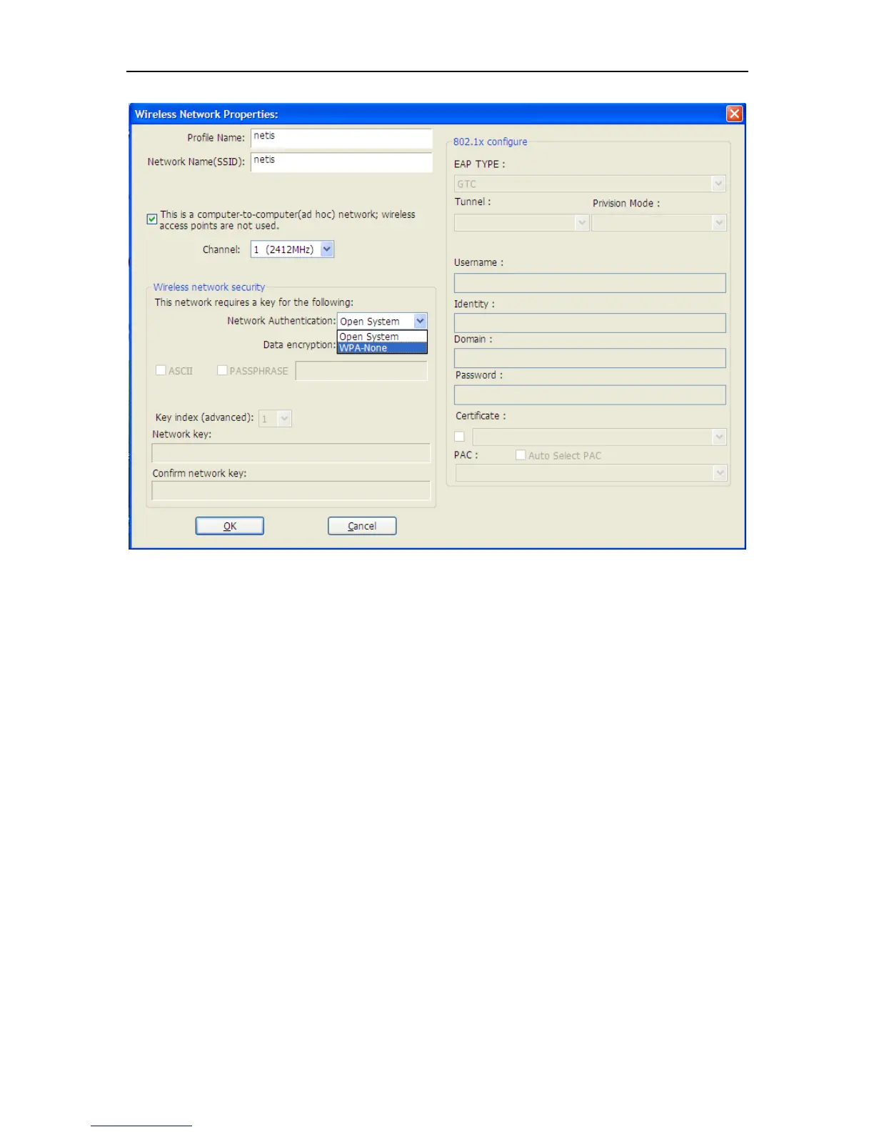 Choose the Network Authentication Mode and Data encryption from the drop-down menu. And