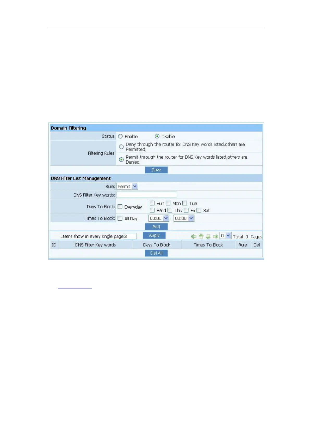 DNS Filter Key words: Input website name or Domain name in the “DNS Key Words”
