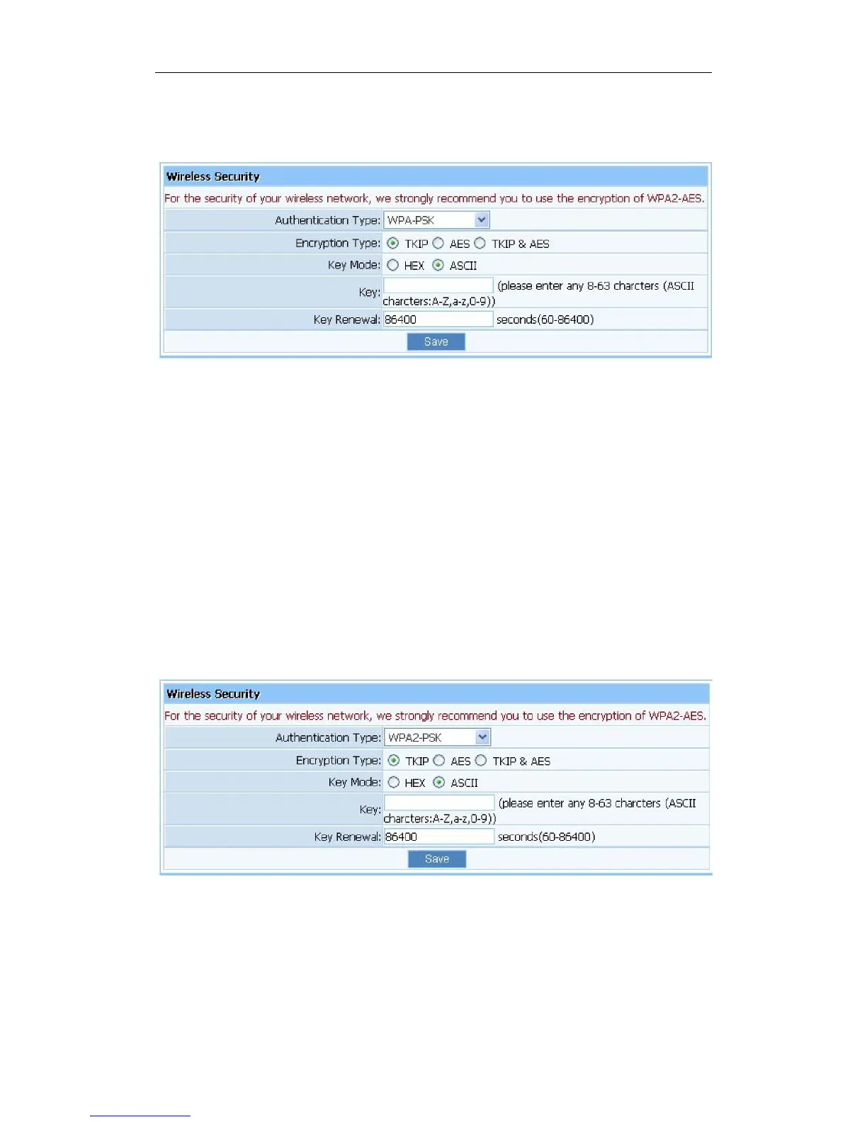 Ø Encryption type: You can select the algorithm you want to use, TKIP, AES or