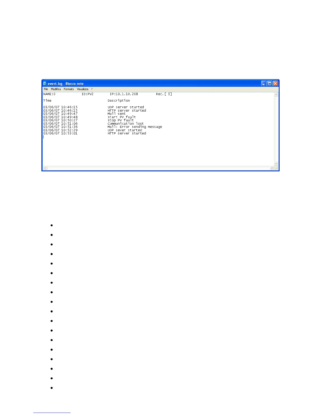 dell‟inverter sul file „event.log‟. Il file può essere scaricato via FTP o inviato tramite e-mail
