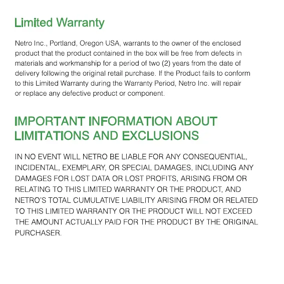 Netro PIXIE-Z1 - Limited Warranty; Warranty Terms and Conditions; Limitations and Exclusions