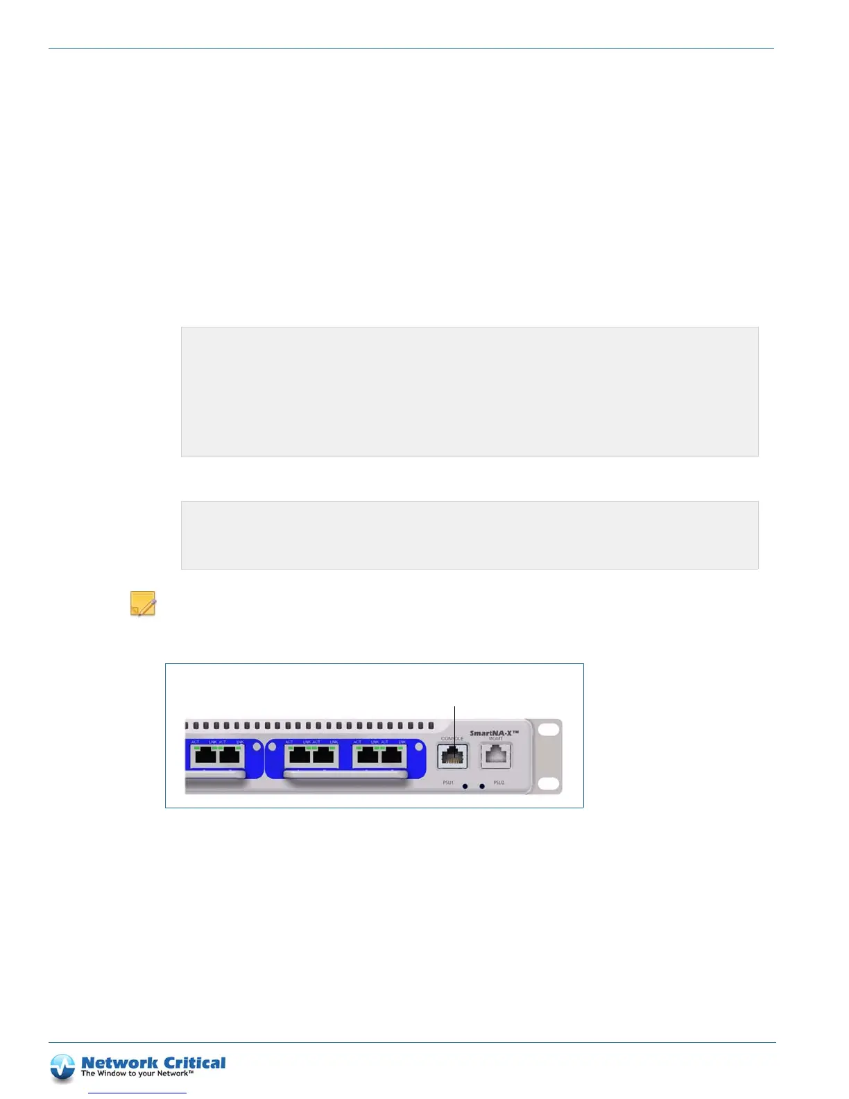 SmartNA-X Console/Serial port using a DE-9 female to 8P8C (RJ45) serial management cable (supplied). To