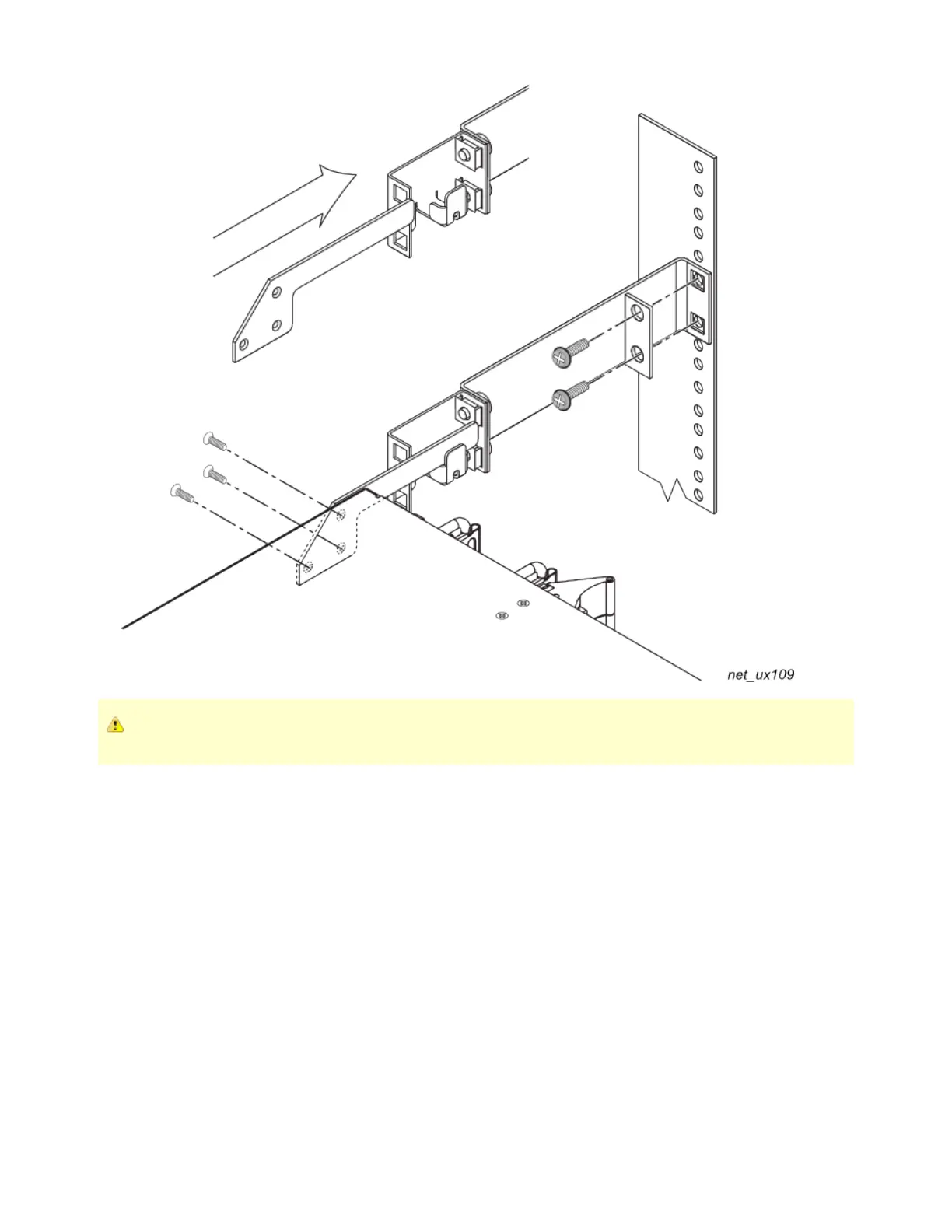 Working with a partner, lift the UX chassis and slide it into the equipment rack, making sure to seat each pan handle plate into the support