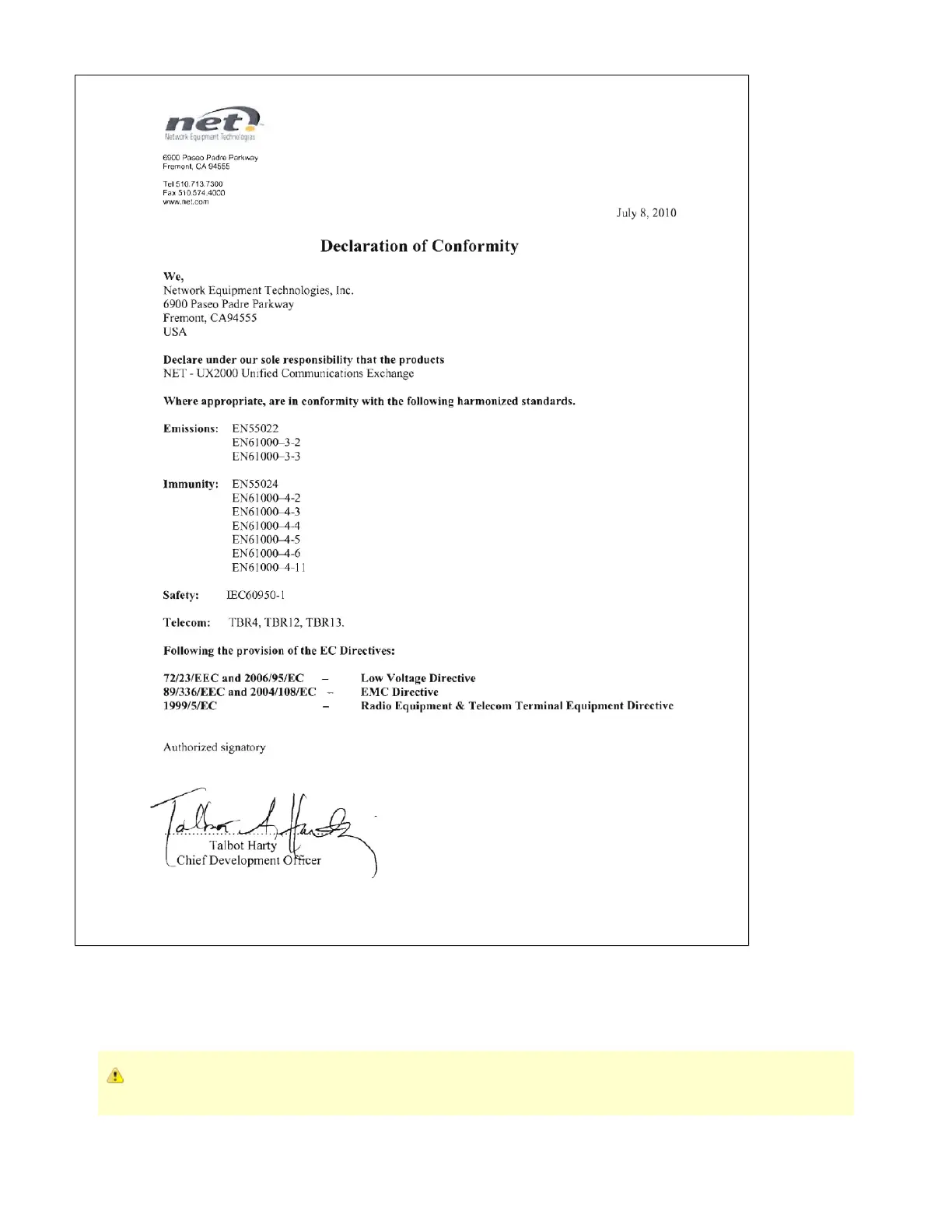 Network Equipment Technologies SBC 2000 - Electromagnetic Compatibility Information