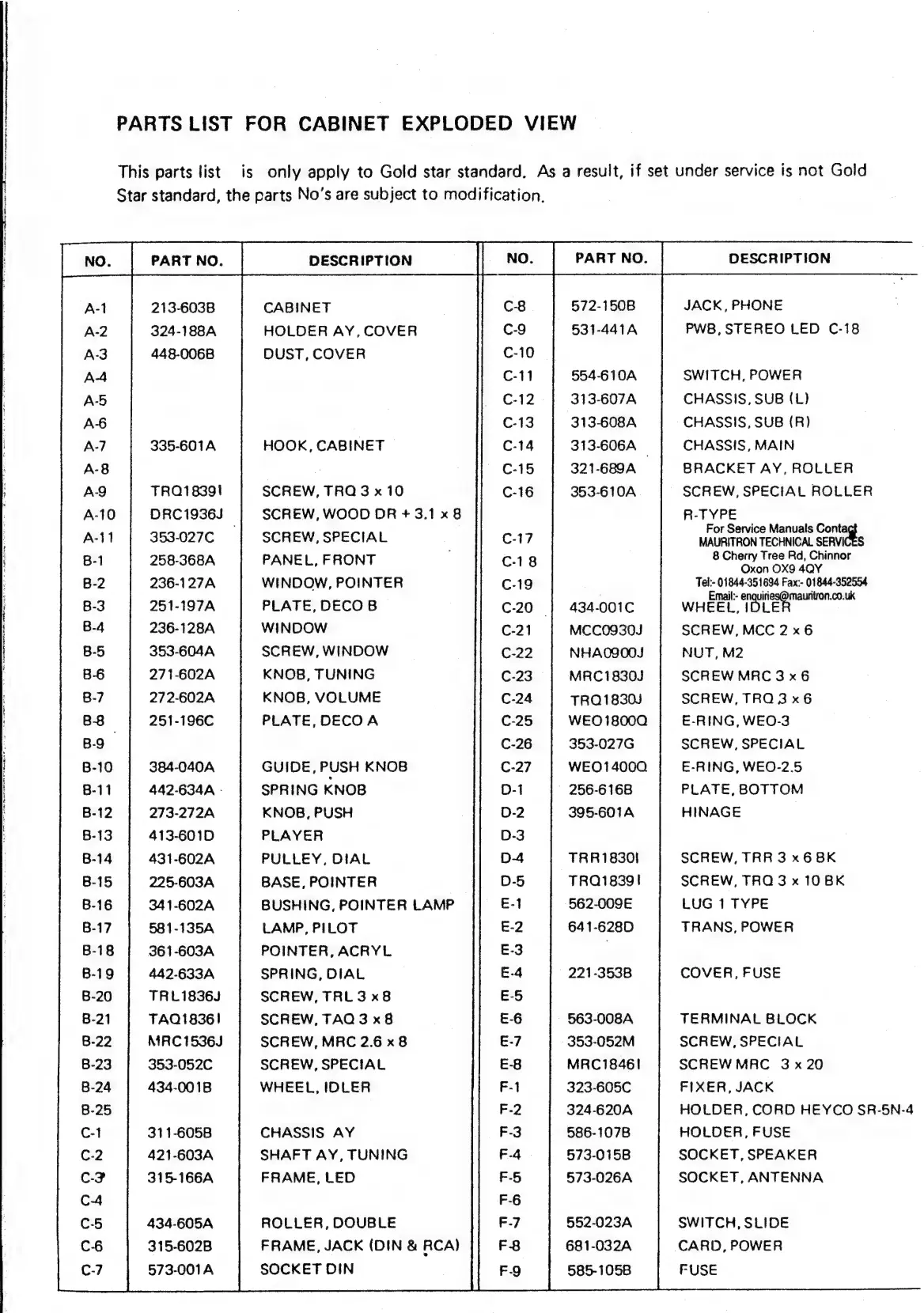 network 600 - Cabinet Parts List; Cabinet Components