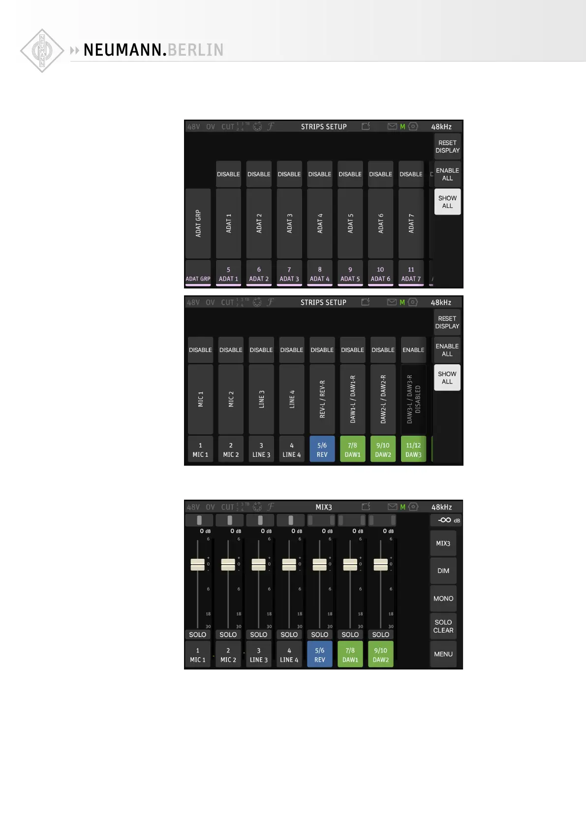 4. In the MT 48 Mixer, remove the ADAT Input channels. Go to MENU → STRIPS SETUP and