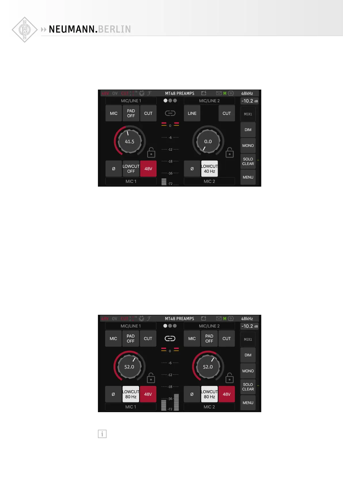 • LOW CUT activates a filter to combat rumble. The cut-o frequency is selectable: 40/60/80