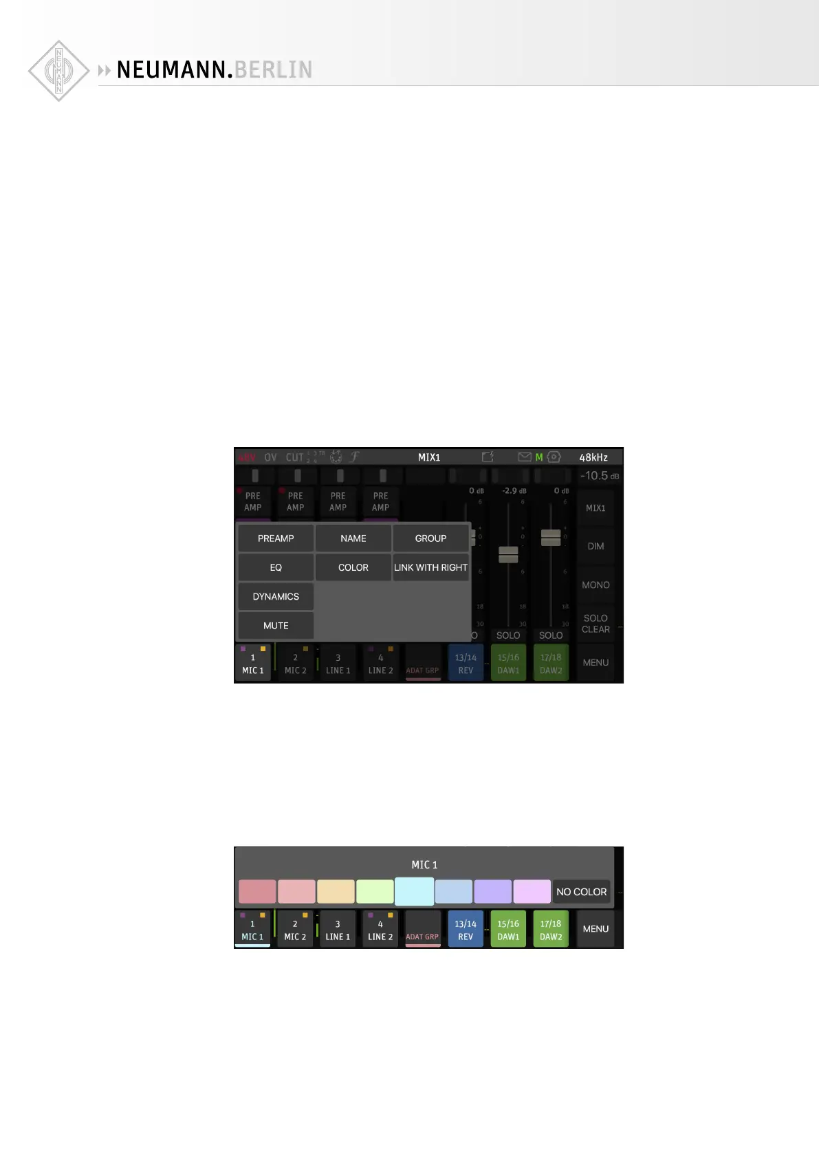 • COLOR lets you choose a color for the channel name lettering and an indicator strip below