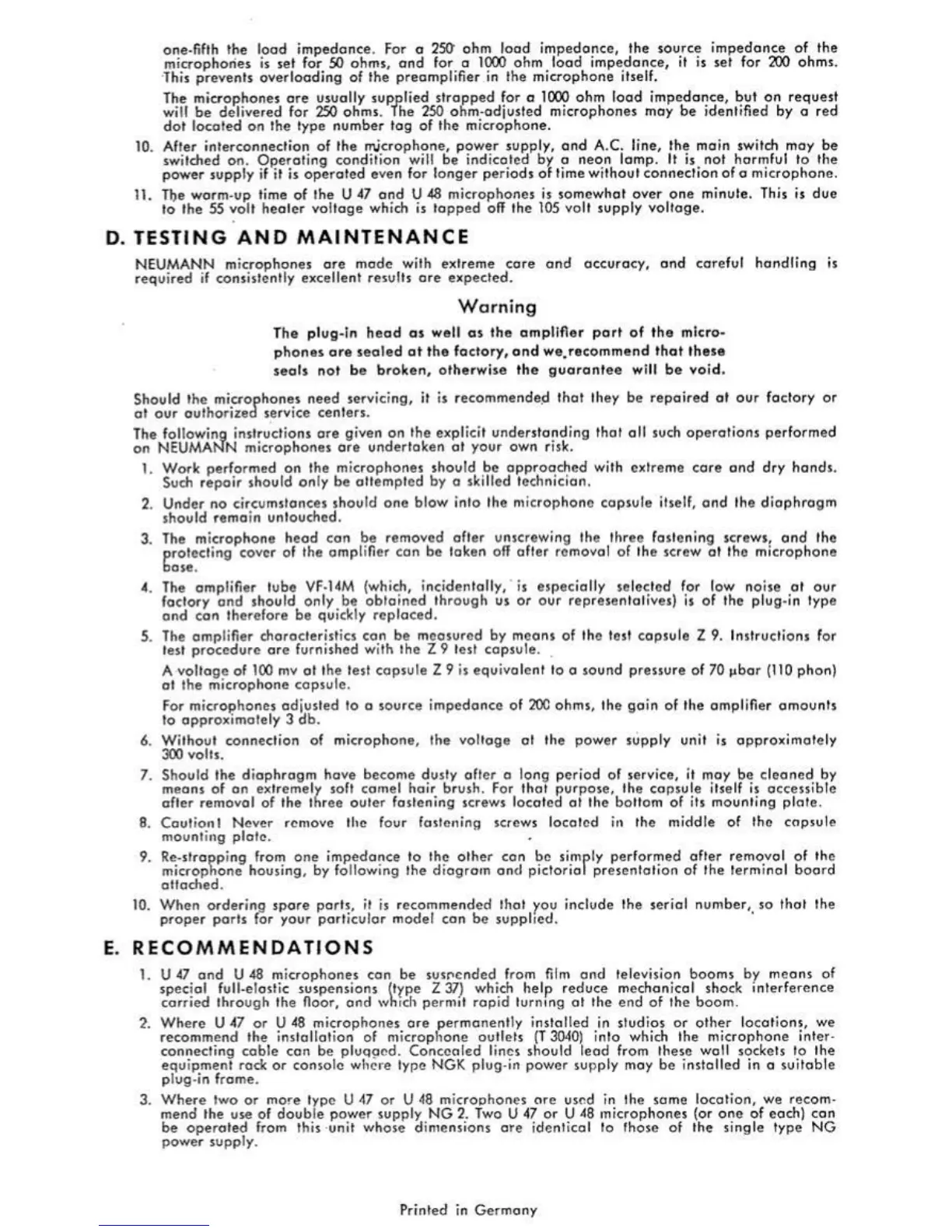 Neumann U47 - Testing and Maintenance; Recommendations